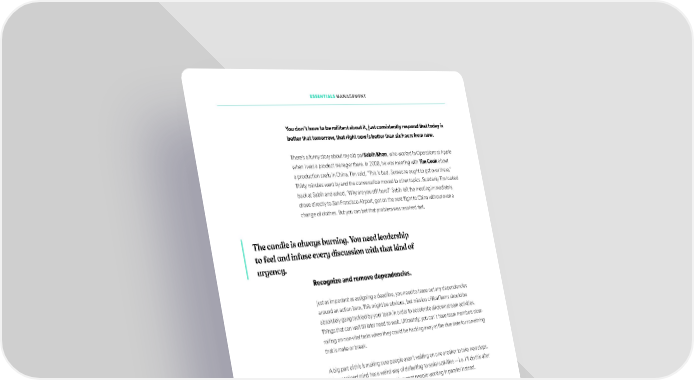 ESSENTIALS MANAGEMENT You don’t have to be militant about it, just consistently respond that today is better that tomorrow, that right now is better than six hours from now. There’s a funny story about my old pal Sabih Khan, who worked in Operations at Apple when I was a product manager there. In 2008, he was meeting with Tim Cook about a production snafu in China. Tim said, “This is bad. Someone ought to get over there.” Thirty minutes went by and the conversation moved to other topics. Suddenly Tim looked back at Sabih and asked, ‘Why are you still here?’ Sabih letf the meeting immediately, drove directly to San Francisco Airport, got on the next lfight to China without even a change of clothes. But you can bet that problem was resolved fast. The candle is always burning. You need leadership to feel and infuse every discussion with that kind of urgency. Recognize and remove dependencies. Just as important as assigning a deadline, you need to tease out any dependencies around an action item. This might be obvious, but mission critical items should be absolutely gang tackled by your team in order to accelerate all downstream activities. Things that can wait till later need to wait. Ultimately, you can’t have team members slow- rolling on non-vital tasks when they could be hacking away at the due date for something that is make or break. A big part of this is making sure people aren’t waiting on one another to take next steps. The untrained mind has a weird way of defaulting to serial activities — i.e. I’ll do this atfer you do that atfer X, Y, Z happens. You want people working in parallel instead. A lot of people assume dependencies where they don’t even exist. How can you turn serial dependencies into parallel action? As a CEO, I insert myself at different points in a process to radically accelerate things. For example, if we’re coming up on an announcement and time is of the essence, I might jump in and just write the blog post myself. It’s not that my team couldn’t do it. I just know it would be faster since I’m the one who’s picky about the content anyway. As a leader, it’s your job to recognize the dependencies and non-dependencies, and take action depending on how critical the thing is and when it’s due. Ten times a day I’ll ifnd myself sitting in a meeting saying, “We don’t need to wait for that thing, we can do this now.” That thought is so common. It’s just that people need to say it out loud more otfen. 47