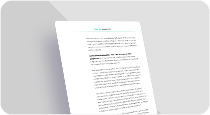 ESSENTIALS MANAGEMENT The interview process is your ifrst and best opportunity to prevent factions from forming. Learning how candidates — your future colleagues — interact with people and how they handle conlfict is key. Of course, few people will lead with “It’s my way or the highway!” in an interview. Here’s how Grosse and Lotfesness recommend subtly sussing this faction- building mindset out: Ask candidates about conlficts — note if they focus more on plot or perspectives. Even if you haven’t had time to fully lfesh out your company values, hiring for empathy—the ability to see a colleague’s perspective, and understand needs that compete with one’s own — will serve you well. There are a number of approaches to try. When interviewing engineers, Grosse likes to ask about a conlfict they’ve had with the product team. “When it comes to tech debt, there’s a common conlfict between making things right and getting something out the door quickly to get feedback,” he says. “I just want to hear that engineering candidates understand the views and the needs of the people on the other side of that debate. I don’t want to hear that they agreed with everything, but I want to know that they understand that it’s that balance that helps generate the best business outcomes.” Folks that don’t have empathy will talk about the surface-level detail. “They recount: here’s what we’re ifghting about, here’s why I was right and they were wrong, here’s how we resolved it. In those cases you’ll otfen hear about escalations to management or some kind of power play,” says Lotfesness. An empathetic thinker, on the other hand, will seek to understand and articulate the root of the conlfict. “They’ll be able to say, ‘Here’s what I was feeling. And here’s why the other person was feeling differently.’ Reaching this understanding requires empathy and is otfen the surest path to resolution.” Test an ability to empathize with one of Lotfesness’ favorite interview questions: How do you know what you don’t know, and what do you do when you realize that? “The intent is to determine whether candidates, particularly for leadership roles, know how to seek and incorporate outside perspectives,” says Lotfesness. “Dig into speciifc examples. You want to hear a demonstrable willingness to hear fresh ideas — even if they don’t ultimately adopt them.” Inquire about a speciifc type of collaboration: cross-disciplinary teamwork. “I’m passionate about cross-disciplinary teams, so I usually ask people how their teams worked at former companies. What cross-team interactions are they used to?” says Grosse. “This line of questioning is particularly critical for more senior hires, or anyone who’s spent their career in a corporate environment, where siloes can form. That’s not to say those candidates can’t thrive in a startup—but you need to ensure that they can and want to work with far less structure and hierarchy than they’re used to.” To get to the heart of this question, ask: What would you improve, if you had complete freedom to change how your team was structured and worked?’ What you’re looking to see is if they naturally incorporate other functional areas and perspectives into their 83
