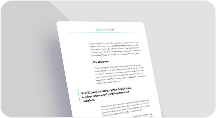 ESSENTIALS MANAGEMENT Graham claims that for the majority of companies, the true chaos of scaling (and also the formation of most of your company’s identity) happens roughly between 30 and 750 people. Atfer that milestone, the scaling emotions are more team-oriented rather than company-oriented — like “Wow, now engineering is growing so fast!” vs. “Facebook is growing so fast!” These phases and how to handle them apply to team scale as well. 30 to 50 Employees “There’s something really interesting that happens when a company can’t ift around one table anymore — things just start to get a lot harder,” says Graham. “Where it used to be simple to communicate, people suddenly complain that they don’t know what’s going on anymore. They don’t know why you’re making certain decisions. They don’t know each other as well. They don’t know what they should be doing. I’ve seen so many companies really struggle in this phase.” 30 to 50 people is where you go from being a family to being a company, and everything starts to get really hard. With under 30 people, everyone knows each other well enough to walk up and strike up a conversation with practically anyone. You don’t even need to invest that much in communication. People can turn around in their chairs and talk to each other, and the priorities are clear because everyone’s talking about them all the time. “When things start to change at this tipping point, it’s the CEO who feels it most,” says Graham. “I’ve talked to a number of people who are experiencing this and they say it’s like night and day. At 50 people, everything that used to come naturally is now a struggle. And as a new leader, you start getting diiffcult questions that you’ve never had to answer before. I had a CEO tell me that someone asked them about their career path at the company, and they were like ‘I don’t know! Why are you asking that? We have so much to do!’ Or you have someone ask, ‘How do I do XYZ?’ and you want to say, ‘How do you not know that?!’ But it’s not their fault. Things have changed. You’re a company now — not just a team — and you have to start acting like one.” The best remedy here is to start writing things down — especially the stuff that’s never needed to be formal or oiffcial before, like mission, values, philosophies. (You can see more of Graham’s advice on how to approach writing these things down here.) “Who we are and how we do things — write that down as fast as you can before you hit rapid growth (ideally),” says Graham. “Yes, that might seem like a nuts thing to do at 25 59