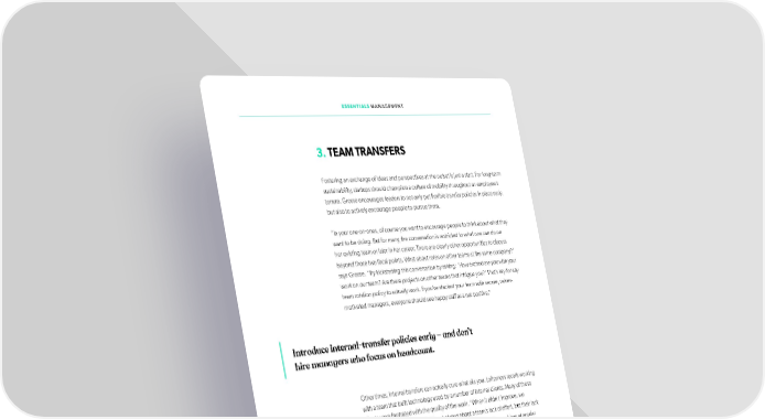 ESSENTIALS MANAGEMENT 3. TEAM TRANSFERS Fostering an exchange of ideas and perspectives at the outset is just a start. For long-term sustainability, startups should champion a culture of mobility throughout an employee’s tenure. Grosse encourages leaders to not only put lfexible transfer policies in place early, but also to actively encourage people to pursue them. “In your one-on-ones, of course you want to encourage people to think about what they want to be doing. But for many, the conversation is restricted to what one can do on her existing team or later in her career. There are clearly other opportunities to discuss beyond those two focal points. What about roles on other teams at the same company?” says Grosse. “Try kickstarting this conversation by asking: ‘How excited are you with your work on our team? Are there projects on other teams that intrigue you?’ That’s key for any team rotation policy to actually work. If you’ve stacked your team with secure, values- motivated managers, everyone should see happy staff as a net positive.” Introduce internal-transfer policies early — and don’t hire managers who focus on headcount. Other times, internal transfers can actually cure what ails you. Lotfesness recalls working with a team that built technology used by a number of internal clients. Many of those clients were frustrated with the quality of the work. “When it didn’t improve, we needed another way forward. It’s not always about a team’s lack of effort, but their lack of exposure to the challenge at hand. Sometimes describing the problem at regular intervals isn’t enough — you have to embed someone who’s living through it,” says Lotfesness. “So, we actively encouraged a tech lead from one of those client teams to join and lead the technology team. Not all problems were resolved immediately, but overnight, the nature of the relationship changed.” There was an infusion of empathy, as a former internal client saw ifrsthand the challenges that technology team faced — and communicated it to his former team on the other side. The struggling team, too, got direct insight into what the client needed. “What they needed was not just a new manager, but a translator — someone who could be lfuent in both team’s realities. Leadership can use this technique to defuse tensions when they notice them occurring,” says Lotfesness. “Actively rotating people through a team can really bring fresh perspective and a deeper understanding of the other side.” 88