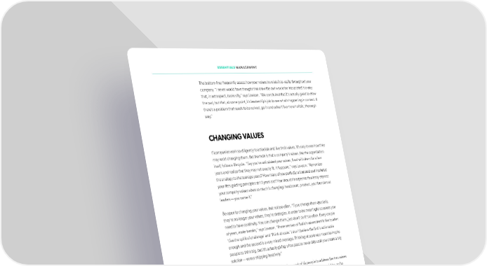 ESSENTIALS MANAGEMENT The bottom line: frequently assess how your values translate into reality throughout your company. “I never would have thought that draw the owl would be interpreted in a way that, in retrospect, looks silly,” says Lawson. “We concluded that it’s actually good to draw the owl, but that, at some point, it’s leadership’s job to see what’s happening in context. If there’s a problem that needs to be solved, go in and solve it in a more holistic, thorough way.” CHANGING VALUES If companies work so diligently to articulate and live their values, it’s easy to see how they may resist changing them. But the truth is that a company’s values, like the organization itself, follow a lifecycle. “Say you’ve articulated your values, lived with them for a few years and realize that they may not exactly ift. It happens,” says Lawson. “Remember the analogy to the teenage years? How many of you perfectly articulated and instituted your life’s guiding principles at 13 years old? You shouldn’t expect to lfawlessly express your company values when so much is changing: headcount, product, your founders as leaders — you name it.” Be open to changing your values, but not too otfen. “If you change them quarterly, they’re no longer your values, they’re strategies. In order to be meaningful as values you need to have continuity. You can change them, just don’t do it too otfen. Every couple of years, make tweaks,” says Lawson. “There are two of Twilio’s values that I’d like to alter: ‘Live the spirit of challenge’ and ‘Think at scale.’ I don’t believe the ifrst is actionable enough and the second is a very mixed message. Thinking at scale was meant to inspire people to think big, but it’s actually giving a free pass to never ship until you create a big solution — versus shipping iteratively.” About a year ago, Lawson convened a diverse set of his people to address the two values that didn’t resonate with him. He didn’t know what the best solution would be, so he took the same approach as he did with the team that helped express the initial set of values. Lawson asked a simple question: If we were to change some of these values, what would we change them to? “Across the board, people were against altering or swapping out the values. I couldn’t get them to budge,” says Lawson. “But remember. It’s the tribe’s values, not mine. I can’t force these changes. People were so attached to them because they had been living them every day.” 106