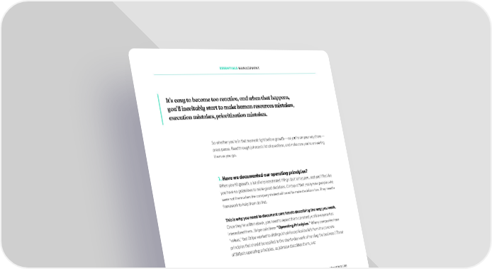 ESSENTIALS MANAGEMENT It’s easy to become too reactive, and when that happens, you’ll inevitably start to make human resources mistakes, execution mistakes, prioritization mistakes. So whether you’re in that moment right before growth — or you’re on your way there — press pause. Read through Johnson’s list of questions, and make sure you’re answering them as you go. 1. Have we documented our operating principles? When you hit growth, a lot of unprecedented things start to happen, and you’ll feel like you have no guidelines to make good decisions. On top of that, many new people who were not there when the company started will need to make decisions too. They need a framework to help them do that. This is why you need to document core tenets describing the way you work. Once they’re written down, you need to repeat them constantly until everyone has internalized them. Stripe calls them “Operating Principles.” (Many companies have “values,” but Stripe wanted to distinguish philosophical beliefs from the concrete principles that should be applied to the day-to-day work of running the business.) Three of Stripe’s operating principles, as Johnson describes them, are: Users ifrst: “We always start with what our users need or would like, and then consider things like like infrastructure, internal constraints, partnerships, product roadmap, and so on.” Think rigorously: “We care about getting things right and it otfen takes reasoning from ifrst principles to get there. We work hard to detect the errors in received wisdom. Rigor doesn’t mean not-invented-here syndrome; we’re interested in the world around us and think that other companies, industries, and academic ifelds have a lot to teach us. But in many cases progress comes from taking paths less traveled.” Trust and amplify: “We want to work in a company of deeply good people who treat their colleagues exceptionally well. People should be committed to amplifying one another: to going out of their way to help each other in both the short- and long-term.” 66