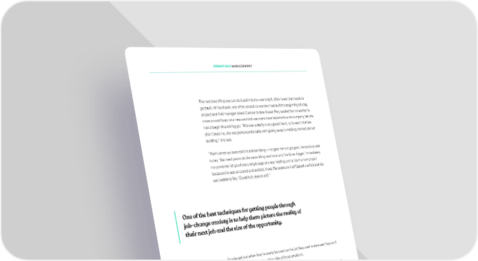 ESSENTIALS MANAGEMENT The next best thing you can do is point to the new bright, shiny tower that needs to get built. At Facebook, one of her closest co-workers had built the beginning of a big project and their manager asked Graham to take it over. They wanted her co-worker to move on and focus on a new area that was even more important to the company, but she had a tough time letting go. “This was actually a very good friend, so it wasn’t that she didn’t trust me, she was just uncomfortable with giving away something she had started building,” she says. “That’s when our boss did this brilliant thing — he gave her a huge goal. He basically said to her, ‘We need you to do the same thing over here only ifve times bigger.’ Immediately, my co-worker let go of every single Lego she was holding and ran to the new project because she was so scared and excited. It was like someone had lfipped a switch and she was suddenly like, ‘Good luck, peace out!’” One of the best techniques for getting people through job-change anxiety is to help them picture the reality of their next job and the size of the opportunity. People get lost when they’re overly focused on the job they used to have and they can’t see what awaits them on the other side of these emotions. “If you want to be one of these type of people who started at Facebook at 25 people and ended up running a huge department, you have to get really good at giving away your Legos,” says Graham. “If you hold on to answering customer support queries yourself or writing all the blog posts yourself, you’re never going to run customer support or product marketing.” 57