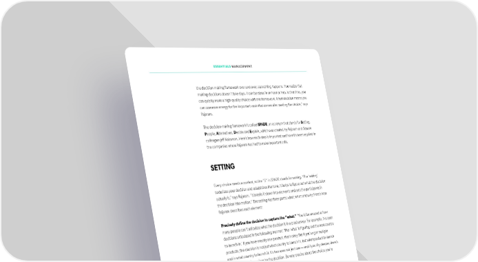 ESSENTIALS MANAGEMENT the decision-making framework over and over, something happens. You realize that making decisions doesn’t take days. It can be done in an hour or two. In that time, you can quickly make a high-quality choice with this framework. A fast decision means you can conserve energy for the important work that comes atfer making the choice,” says Rajaram. The decision-making framework is called SPADE, an acronym that stands for Setting, People, Alternatives, Decide and Explain, which was created by Rajaram and Square colleague Jeff Kolovson. Here’s how each step is important and how it’s been applied in the companies where Rajaram has had to make important calls. SETTING Every choice needs a context, so the “S” in SPADE stands for setting. “The ‘setting’ texturizes your decision and establishes the tone. It helps to ifgure out what the decision actually is,” says Rajaram. “It breaks it down into elements and sets the participants in the decision into motion.” The setting has three parts: what, when and why. Here’s how Rajaram describes each element: Precisely deifne the decision to capture the “what.” “You’d be amazed at how many people can’t articulate what the decision is in a precise way. For example, I’ve seen decisions articulated in the following manner: ‘The ‘what’ is ifguring out the next country to launch in.’ If you have exactly one product, that’s okay. But if you’ve got multiple products, the decision is not just what country to launch in, but what product to launch and in what country to launch it. It’s two axes not just one — and if you dig deeper, there’s probably more dimensions to the decision. Be very precise about the choice you’re making.” Calendar the exact timeline for the decision to realize the “when.” It must relfect not only the duration it’ll take to make the choice, but also the reason why it’ll take that amount of time. “Be sure to think critically about the ‘why.’ If someone says a decision must be made by October 15th, 2015, why must that be? Does it matter? Here’s an example: The product needs to launch on November 15th, 2015 and therefore I need the name determined by October 15th, so this name can lfow through in the collateral, into the website and into the app. I need four weeks for that. That logic helps people understand the when, and the ‘why’ of the ‘when.’” Parse the objective from the plan to isolate the “why.” Articulating the “why” is the key to establishing the setting. “The why deifnes the value of the choice. It explains what you’re optimizing for and reveals why the decision matters. I’m an advisor to a startup at which the head of product management and the head of product marketing had a massive blow-up. They disagreed about how to price a product. Working through it, 35