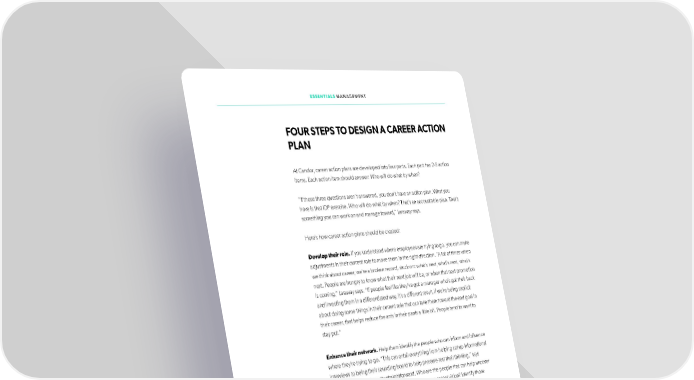 ESSENTIALS MANAGEMENT FOUR STEPS TO DESIGN A CAREER ACTION PLAN At Candor, career action plans are developed into four parts. Each part has 2-5 action items. Each action item should answer: Who will do what by when? “If those three questions aren’t answered, you don’t have an action plan. What you have is that IDP exercise. Who will do what by when? That’s an accountable plan. That’s something you can work on and manage toward,” Laraway says. Here’s how career action plans should be created: Develop their role. If you understand where employees are trying to go, you can make adjustments in their current role to move them in the right direction. “A lot of times when we think about career, we’re a broken record, stuck on: what’s next, what’s next, what’s next. People are hungry to know what their next job will be, or when that next promotion is coming,” Laraway says. “If people feel like they’ve got a manager who’s got their back and investing them in a differentiated way, it’s a different result. If we’re being explicit about doing some things in their current role that can take them toward the end goal in their career, that helps reduce the ants in their pants a little bit. People tend to want to stay put.” Enhance their network. Help them identify the people who can inform and inlfuence where they’re trying to go. “This can entail everything from helping set up informational interviews to being their sounding board to help pressure-test their thinking,” says Laraway. “Inlfuence is pretty straightforward. Who are the people that can help uncover opportunities that’ll take them closer to their long-term career vision? Identify those people and help them get some meetings.” Laraway stresses that it’s a way of providing 360-degree support to your employee. “The more they explore future possibilities, the more they’ll be engaged in their work. Meeting people who are in their dream industry or job can be inspiring and clarifying. It also helps forge connections that may come in handy down the line,” Laraway says. “And it yields beneifts for you, too. It’s so important for your employee to know how much you’re supportive of them, and how far you’re willing to go to make sure they achieve their dream job. That inspires loyalty like nothing else.” Deifne their immediate next step.“Let’s be explicit about what the next step or role you will ifll that makes sense, given what you care about, the path behind you, and the lighthouse off in the distance,” Laraway says. “It can involve advocating for them to make a lateral or vertical move, or giving them goalposts to hit on a quarterly basis. You want to help them gain crystal clarity that this immediate next step is a logical one en route to their dreams.” 116