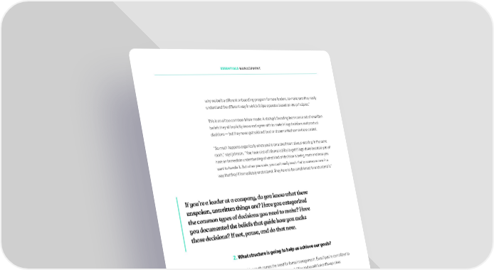 ESSENTIALS MANAGEMENT why we built a different onboarding program for new leaders, to make sure they really understand the different way in which Stripe operates based on our principles.” This is an all too common failure mode: A startup’s founding team uses a set of unwritten beliefs they all implicitly know and agree with to make hiring decisions and product decisions — but they never get said out loud or documented somewhere central. “So much happens organically when you’re on a small team always working in the same room,” says Johnson. “You have a lot of informal ability to get things done because you all have an immediate understanding of what kind of decision is being made and how you want to handle it. But when you scale, you can’t easily teach that to someone new in a way that they’ll immediately understand. They have to be conditioned to understand it.” If you’re a leader at a company, do you know what these unspoken, unwritten things are? Have you categorized the common types of decisions you need to make? Have you documented the beliefs that guide how you make those decisions? If not, pause, and do that now. 2. What structure is going to help us achieve our goals? Along with growth comes the need for formal management. Even if you’re committed to staying pretty lfat, you need make responsibilities and escalation pathways clear. “Flatness is really a state of mind,” says Johnson. “You can make your org feel lfat while still having a good chain of authority in place so people don’t have too many direct reports, and there’s a clear way way escalate issues. We do it by not having a lot of titles or signals of seniority, because we want all people to speak up and contribute. Whether or not you get included in a meeting is always about how much you know about a given issue or problem, not about hierarchy. But everyone still explicitly knows who their manager is.” This is what works for Stripe. But every company needs to decide on a structure that ifts their speciifc goals. Maybe you need more hierarchy to execute on very complex processes with a lot of hand-offs. Maybe you need less because you want all employees to be immediately responsive to customers’ questions without having to double-check with someone else. 68