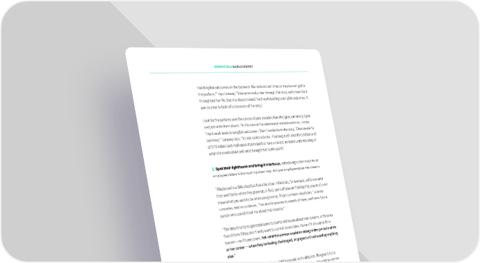 ESSENTIALS MANAGEMENT had tangible outcomes on the backend. We reduced our times or maybe even got to the podium,’” says Laraway. “It became really clear through that story, and others like it throughout her life, that she deeply valued hard work leading to tangible outcomes. It was so clear to both of us because of the story.” Look for the patterns over the course of your people’s lives that give you strong signal and just write them down. “In this case of the cheerleader-turned-swimmer, I wrote, ‘Hard work leads to tangible outcomes.’ Then I wrote down the story, ‘Cheerleader to swimmer,’” Laraway says. “It’s not rocket science. I had pages of notes that yielded a list of 5-10 values and motivators that helped us have a shared, textured understanding of what she cared about and what brought her to this point.” 2. Spot their lighthouse and bring it into focus. Articulating a clear vision for an employee’s future is the most important step. Ask your employee about their dreams. “Maybe we’re a little skeptical that a lot of our millennials, for example, will know what they want to be when they grow up. In fact, some of you are thinking that you don’t even know what you want to be when you grow up. That’s common skepticism,” Laraway concedes, but he continues, “I’ve run this process hundreds of times, and never had a person who couldn’t tell me about their dreams.” “The idea is to try to get employees to start to talk to you about their dreams, or three to ifve of them if they don’t really want to commit to one idea. None of it should be time- bound — no 10-year plans. Ask what this person would be doing at the pinnacle of his or her career — when they’re feeling challenged, engaged and not wanting anything else.” “What we have now is a blurry, fuzzy lighthouse out in the distance. The goal is to try to bring that lighthouse into focus. We want to see the paint chips. We want to see the red tiles on top. We want to see the seagull perched on it. We’ve got to ask a few more questions,” Laraway says. He suggests the following three questions for focusing the vision only atfer you both understand the dream: What size company do you imagine working for? What industry do you want to be in? Do you want to be in a very senior individual contributor type role or very senior management type role? 114