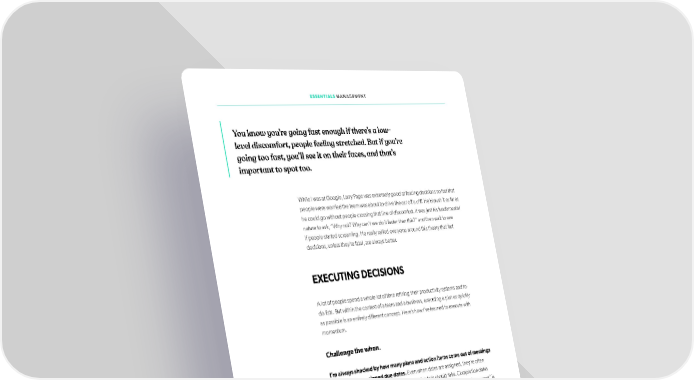 ESSENTIALS MANAGEMENT You know you’re going fast enough if there’s a low- level discomfort, people feeling stretched. But if you’re going too fast, you’ll see it on their faces, and that’s important to spot too. While I was at Google, Larry Page was extremely good at forcing decisions so fast that people were worried the team was about to drive the car off a cliff. He’d push it as far as he could go without people crossing that line of discomfort. It was just his fundamental nature to ask, “Why not? Why can’t we do it faster than this?” and then wait to see if people started screaming. He really rallied everyone around this theory that fast decisions, unless they’re fatal, are always better. EXECUTING DECISIONS A lot of people spend a whole lot of time reifning their productivity systems and to- do lists. But within the context of a team and a business, executing a plan as quickly as possible is an entirely different concept. Here’s how I’ve learned to execute with momentum. Challenge the when. I’m always shocked by how many plans and action items come out of meetings without being assigned due dates. Even when dates are assigned, they’re otfen based on half-baked intuition about how long the task should take. Completion dates and times follow a tribal notion of the sun setting and rising, and too otfen “tomorrow” is the default answer. It’s not that everything needs to be done NOW, but for items on your critical path, it’s always useful to challenge the due date. All it takes is asking the simplest question: “Why can’t this be done sooner?” Asking it methodically, reliably and habitually can have a profound impact on the speed of your organization. This is deifnitely a tactic that starts with individual employees ifrst — ideally those in senior positions who can inlfuence others’ behavior. As a leader, you want them to make “things I like to do” become “things we like to do.” This is how ideas get ingrained. I’ve seen too many people never question when something will be delivered and assume it will happen immediately. This rarely happens. I’ve also seen ideas lfoat into the ether because they were never anchored in time. 46