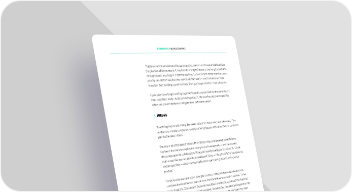 ESSENTIALS MANAGEMENT “I deifne a faction as a subset of the company that starts to put its own priorities before the priorities of the company. It may form for a range of reasons: they’ve got a particular ax to grind with a colleague, a speciifc goal they believe is more critical than the current priority, or a distinct way that they want to do their work — and that becomes more important than building a great business. Then you’ve got a faction,” says Lotfesness. If your team is no longer working together toward a shared vision for the company, it’s time—past time, really—to do something about it. Here are ifve areas where positive action can prevent factions or mitigate them before they fester: 1. HIRING “Everything begins with hiring. The seeds of factions start there,” says Lotfesness. “The number one mistake companies make is not hiring people with values that are consistent with the founders’ vision.” You hear a lot of talk about “culture ift” in Silicon Valley and beyond, but Lotfesness has found that the term implies the wrong kind of homogeneity — and can actually discourage genuine collaboration. What you’re really looking for is a values ift. “I think that’s a way that you can allow for broad-based hiring — hiring for differing backgrounds and perspectives — which can be helpful when you’re trying to build an innovative product.” For his favorite example of this principle in action, Lotfesness leaves tech behind and considers that most famous team of rivals: President Abraham Lincoln’s cabinet. “In her book about this, Doris Kearns Goodwin describes how Lincoln convinced the rivals that he beat for the nomination to join his cabinet, knowing that they bitterly disagreed on key issues. Lincoln’s ability to use divergent perspectives to inform his decisions may have saved the country. Despite their differences of opinion, they all believed in democracy. They all believed in a government of the people, by the people, for the people. Nobody disagreed with that. What they disagreed about was how you manifest those principles in the speciifc practices of government.” In all the hustle to ifnd product/market ift or resonant branding, don’t forget to establish your company’s immutable values. And be precise; explicitly deifning each one is part of predicting and preventing conlfict. At eero, for example, ambition is a core value. “Ambition can express itself as getting to the next rung of a career ladder. Or it can be deifned as bringing on people who are driven by new challenges in an entirely different space than where they were classically trained, which is part of how I ended up working on a hardware product with a sotfware background,” says Lotfesness. “Our founders were bold enough to jump into an entirely new area and successfully ship an innovative product, and that’s a quality we want to see in our new hires as well.” 82