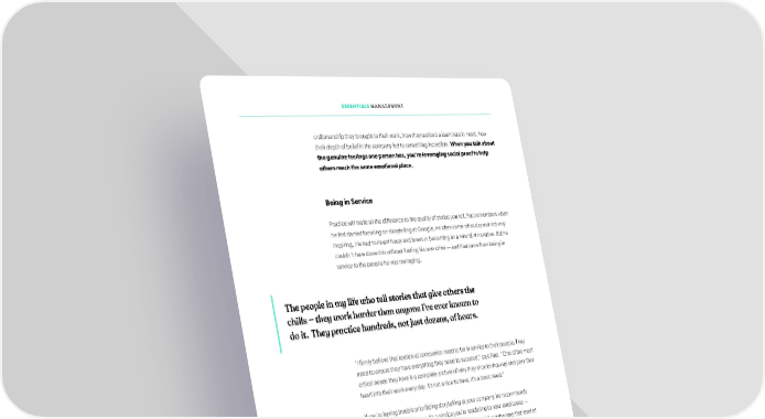 ESSENTIALS MANAGEMENT cratfsmanship they brought to their work, how they assisted a teammate in need, how their depth of belief in the company led to something incredible. When you talk about the genuine feelings one person has, you’re leveraging social proof to help others reach the same emotional place. Being in Service Practice will make all the difference to the quality of stories you tell. Faul remembers when he ifrst started focusing on storytelling at Google, he otfen came off as dry and not very inspiring. He had to invest hours and hours in becoming an a natural at narrative. But he couldn’t have done this without ifnding his own drive — and that came from being in service to the people he was managing. The people in my life who tell stories that give others the chills — they work harder than anyone I’ve ever known to do it. They practice hundreds, not just dozens, of hours. “I ifrmly believe that leaders at companies need to be in service to their people. They need to ensure they have everything they need to succeed,” says Faul. “One of the most critical needs they have is a complete picture of why they should show up and pour their heart into their work every day. It’s not a nice to have, it’s a basic need.” If you’re having trouble prioritizing storytelling at your company, he recommends reframing the skill in this way. It’s a service you’re rendering to your employees — more important than lunch catering or great equipment. Give it the time that level of importance merits. Putting Yourself in Their Place Your employees will be energized by any story that shows that you’ve been where they are before, and that you — as their leader — understand their experience, says Faul. This is true for a host of reasons. They want to know that the people shaping strategy and making decisions see the impact it will have on people. They want to know they’re on the same path to success. They want to be able to feel safe and heard and valued. The more you can make it clear that you’ve been in their shoes, facing the types of challenges they face, the more effective you will be. 21