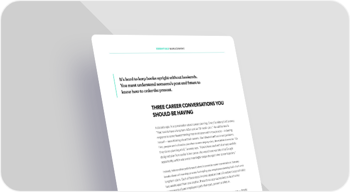 ESSENTIALS MANAGEMENT It’s hard to keep books upright without bookends. You must understand someone’s past and future to know how to order the present. THREE CAREER CONVERSATIONS YOU SHOULD BE HAVING A decade ago, in a conversation about career planning, Sheryl Sandberg told Laraway, “You have to have a long-term vision and an 18-month plan.” Her advice was in response to some lfawed thinking that she’d observed in how people — including herself — were thinking about their careers. She talked about two broad problems. First, people are inclined to plan their careers step-by-step, the mistake she made. “Or they do no planning at all,” Laraway says. “If she’d have stuck with that very carefully designed plan from earlier in her career, she would have not taken that Google opportunity, which was a very meaningful slope-changer in her career trajectory.” Instead, take another path forward when it comes to career conversations. Laraway breaks down a three-step process for helping your employees develop both short- and long-term plans. Each of these steps involves about an hour of investment approximately two weeks apart from one another. These three approaches help surface the key components of your employee’s path: their past, present and future. 1. Be their Barbara Walters. Take an hour to get to know your employees — deeply. Begin with the phrase: Starting with kindergarten, tell me about your life. Then probe with more questions when they talk about pivots in their lives. Laraway took this tactic with a direct report, who mentioned switching from cheerleading to swimming while in high school. “I became curious about why she liked swimming so much better than cheerleading. ‘What was it about swimming?’ She said, ‘I never really thought about it, but when we worked hard and we spent a lot of time in that pool, we 113