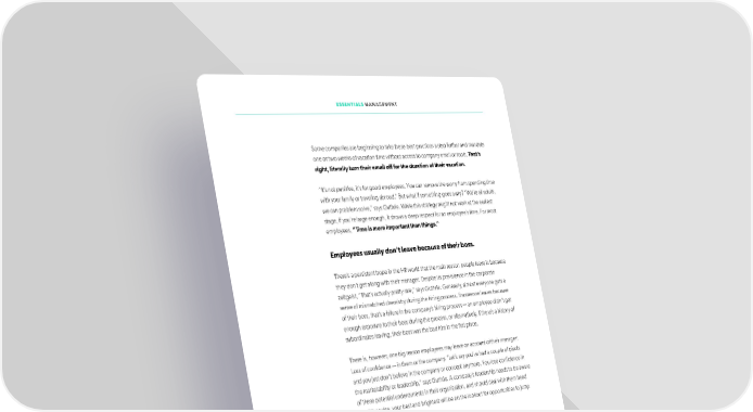 ESSENTIALS MANAGEMENT Some companies are beginning to take these best practices a step further and mandate one or two weeks of vacation time without access to company email or tools. That’s right, literally turn their email off for the duration of their vacation. “It’s not punitive, it’s for good employees. You can remove the worry from spending time with your family or traveling abroad.” But what if something goes awry? “We’re all adults, we can problem solve,” says Guthrie. While this strategy might not work at the earliest stage, if you’re large enough, it shows a deep respect for an employee’s time. For most employees, “Time is more important than things.” Employees usually don’t leave because of their boss. There’s a persistent trope in the HR world that the main reason people leave is because they don’t get along with their manager. Despite its prevalence in the corporate zeitgeist, “That’s actually pretty rare,” says Guthrie. Generally, almost everyone gets a sense of mismatched chemistry during the hiring process. If someone leaves because of their boss, that’s a failure in the company’s hiring process — an employee didn’t get enough exposure to their boss during the process, or alternatively, if there’s a history of subordinates leaving, their boss was the bad hire in the ifrst place. There is, however, one big reason employees may leave on account of their manager: Loss of conifdence — in them or the company. “Let’s say you’ve had a couple of pivots and you just don’t believe in the company or concept anymore. You lose conifdence in the marketability or leadership,” says Guthrie. A company’s leadership needs to be aware of these potential undercurrents in their organization, and should deal with them head on. Otherwise, your best and brightest will be on the lookout for opportunities to jump ship. If you’re making a counter-offer, you’ve probably already lost. Otfen, to prevent brain drain, a startup will make a counteroffer to someone who says they might depart. But at that point, the battle for that employee is pretty much over anyway. “When you tell an employer you’re leaving, you’re saying, ‘I’m unhappy. You may be able to buy me for another six months, but mostly, it’s the end of the chapter,’” says Guthrie. 121