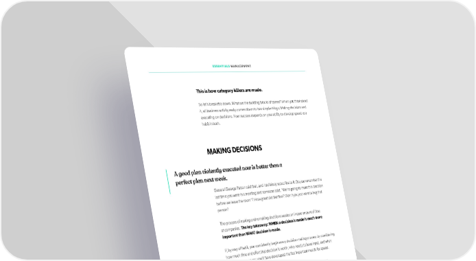 ESSENTIALS MANAGEMENT This is how category killers are made. So let’s break this down. What are the building blocks of speed? When you think about it, all business activity really comes down to two simple things: Making decisions and executing on decisions. Your success depends on your ability to develop speed as a habit in both. MAKING DECISIONS A good plan violently executed now is better than a perfect plan next week. General George Patton said that, and I deifnitely subscribe to it. Do you remember the last time you were in a meeting and someone said, “We’re going to make this decision before we leave the room”? How great did that feel? Didn’t you just want to hug that person? The process of making and remaking decisions wastes an insane amount of time at companies. The key takeaway: WHEN a decision is made is much more important than WHAT decision is made. If, by way of habit, you consistently begin every decision-making process by considering how much time and effort that decision is worth, who needs to have input, and when you’ll have an answer, you’ll have developed the ifrst important muscle for speed. This isn’t to say all decisions should be made quickly. Some decisions are more complicated or critical than others. It might behoove you to wait for more information. Some decisions can’t be easily reversed or would be too damaging if you choose poorly. Most importantly, some decisions don’t need to be made immediately to maintain downstream velocity. Deciding on when a decision will be made from the start is a profound, powerful change that will speed everything up. In my many years at Google, I saw Eric Schmidt use this approach to decision-making on a regular basis — probably without even thinking about it. Because founders Larry and Sergey were (and are) very strong-minded leaders involved in every major decision, Eric knew he couldn’t make huge unilateral choices. This could have stalled a lot of things, 44