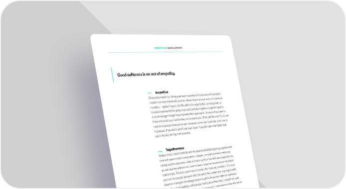 ESSENTIALS MANAGEMENT Good software is an act of empathy. Incentive Drive better results by linking your team’s rewards to the success of the project, not just how they individually perform. Remember that rewards don’t have to be monetary — global impact, visibility within the organization, career growth, or increased passion for the project can all incentivize engineers to perform better. A lot of managers forget how important their approval is. The bulk of your team is there and working as hard as they can to please you . That’s just the way it is, so you have to let people know when you’re pleased, when you’re excited, when you’re impressed. If you don’t, and if your team doesn’t get this type of reinforcement, you’re literally limiting their potential. Togetherness Reduce stress, boost creativity and increase productivity by giving engineers the time and space to build camaraderie. Happier, compatible teams create long- lasting positive outcomes. I take my teams out to dinner and encourage them to go out together without me. I seat my teams together because proximity builds relationships. The more you know someone, the more you trust them. The more you trust the people you work with, the better the product you’re going to build. Quantum managers encourage people to get to know each other on a personal level. They start meetings with people sharing about their lives, not just their work. They seed conversations about topics that are much more expansive than the task at hand so people truly get to know each other. 5. Embrace the challenge of self-observation. As managers, it’s diiffcult to recognize if we’re using our quantum leadership techniques effectively because — like Schrödinger’s cat — we exist in a state of success and failure simultaneously. Seeking constant feedback from those outside our quantum management box — like from our peers managing other segments of the business — allows us to stretch and grow without limiting our own outcomes. 14