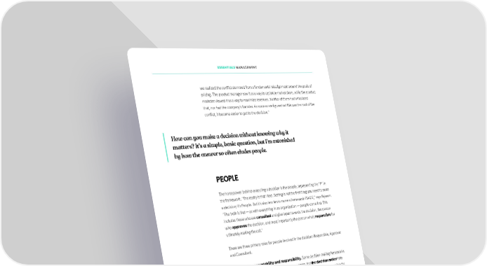 ESSENTIALS MANAGEMENT we realized the conlfict stemmed from a fundamental misalignment around the goals of pricing. The product manager saw it as a way to optimize market share, while the product marketer viewed it as a way to maximize revenues. Neither of them had articulated that, nor had the company’s founder. As soon as we ifgured out this was the root of the conlfict, it became easier to get to the decision.” How can you make a decision without knowing why it matters? It’s a simple, basic question, but I’m astonished by how the answer so often eludes people. PEOPLE The horsepower behind executing a decision is the people, representing the “P” in the framework. “The reality is that I lied. Setting is not the ifrst thing you need to make a decision; it’s People. But it’s also less fun to name a framework PSADE,” says Rajaram. “The truth is that — as with everything in an organization — people come ifrst. This includes those who are consulted and give input towards the decision, the person who approves the decision, and most importantly the person who’s responsible for ultimately making the call.” There are three primary roles for people involved in the decision: Responsible, Approver and Consultant. Synonymize accountability and responsibility. Some decision-making frameworks separate the responsible from the accountable person, but the decision maker (aka the responsible person) should be both. “At Square, the person who’s responsible for making the decision is the person who’s accountable for its execution and success. We believe accountability and responsibility are the same thing,” says Rajaram. “Here’s why: think of the last time you were handed a decision that someone else made but for which you had to execute and usher to success. How did that feel? I’d guess it made you feel frustrated, powerless or disengaged. We want to avoid that. That’s why the decision maker is both accountable and responsible. It’s more fuliflling and empowering.“ Empowering people means pushing decision making authority to the person who is accountable and can own the decision. Veto decisions mainly for their quality, not necessarily their result. A key participant in the decision-making framework is the approver. “The approver is the person who can veto the decision. Typically, the approver does not vote down the decision itself, rather they veto the quality of the decision,” says Rajaram. “It is a checks-and-balances 36