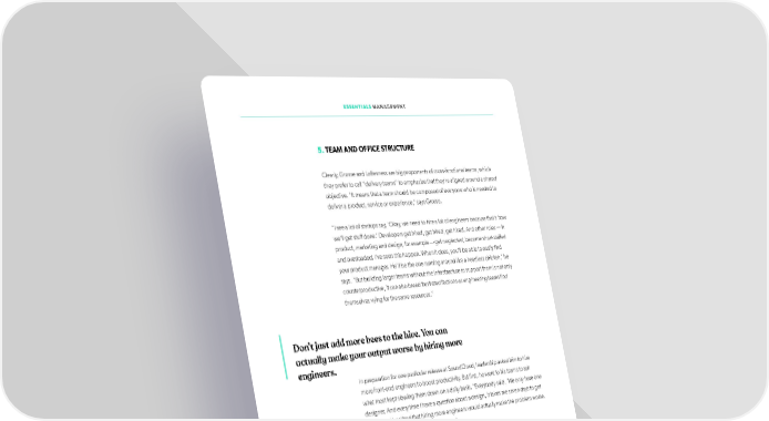 ESSENTIALS MANAGEMENT 5. TEAM AND OFFICE STRUCTURE Clearly, Grosse and Lotfesness are big proponents of cross-functional teams, which they prefer to call “delivery teams” to emphasize that they’re aligned around a shared objective. “It means that a team should be composed of everyone who is needed to deliver a product, service or experience,” says Grosse. “I see a lot of startups say, ‘Okay, we need to hire a lot of engineers because that’s how we’ll get stuff done.’ Developers get hired, get hired, get hired. And other roles — in product, marketing and design, for example — get neglected, become short-staffed and overloaded. I’ve seen this happen. When it does, you’ll be able to easily ifnd your product manager. He’ll be the one running around like a headless chicken,” he says. “But building larger teams without the infrastructure to support them is not only counterproductive, it can also breed frustrated factions as engineering teams ifnd themselves vying for the same resources.” Don’t just add more bees to the hive. You can actually make your output worse by hiring more engineers. In preparation for one particular release at SoundCloud, leadership asked him to hire more front-end engineers to boost productivity. But ifrst, he went to his teams to ask what most kept slowing them down on a daily basis. “Everybody said, ‘We only have one designer. And every time I have a question about a design, it takes me seven days to get an answer.’ I realized that hiring more engineers would actually make the problem worse. Instead, I needed to hire more designers.” Building cross-functional, product-oriented teams means supplying the resources they need, but also demanding that they take full ownership of their deliverables. “When I joined issuu, one of the ifrst things I did was dissolve the QA department to improve quality. I know that sounds counterintuitive,” says Grosse. “There was a little chaos for a week or two, and then teams embraced it and quality improved. They realized that we had to own our own quality — a key value for our team — especially since we didn’t have another team to rely on.’” Embedding all the resources a product demands in a single team — engineering, marketing, operations, and more — fosters resilience and, in most cases, best supports scaling efforts. “When you keep disciplines separate, then you have battles between sales and marketing, or development and QA. Without collaboration, these groups end up just throwing things over the wall to each other,” says Lotfesness. “But if they’re actually sitting together and working on a common problem, that’s less likely to happen.” 92