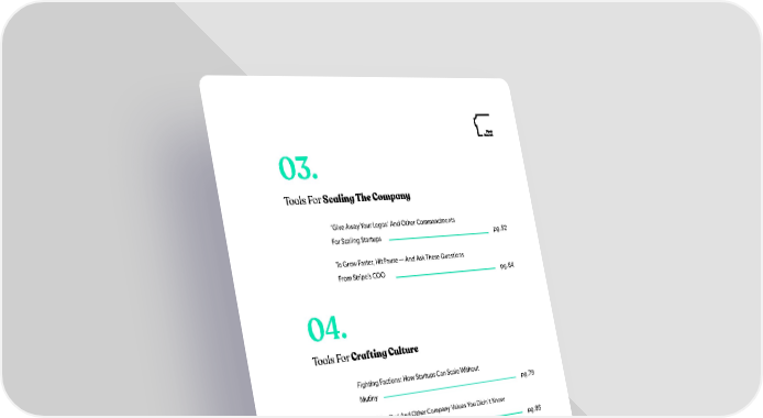 03. Tools For Scaling The Company ‘Give Away Your Legos’ And Other Commandments For Scaling Startups pg.52 To Grow Faster, Hit Pause — And Ask These Questions From Stripe’s COO pg.64 04. Tools For Crafting Culture Fighting Factions: How Startups Can Scale Without Mutiny pg.79 Draw The Owl And Other Company Values You Didn’t Know You Should Have pg.95 05. Tools For Nurturing Talent Three Powerful Conversations Managers Must Have To Develop Their People pg.109 This Is Why People Leave Your Company pg.118 4