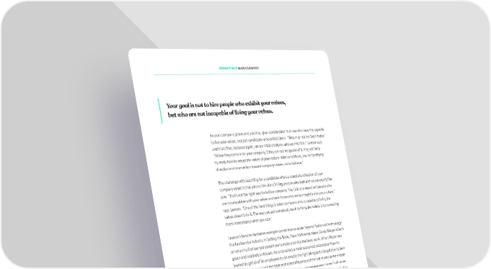 ESSENTIALS MANAGEMENT Your goal is not to hire people who exhibit your values, but who are not incapable of living your values. As your company grows and you hire, give consideration to those who have the capacity to live your values, not just candidates who exhibit them. “They may not live them today and that’s ifne, because again, we are tribal creatures who want to ift in,” Lawson says, “When they come in to your company, if they are not incapable of it, they will likely try really hard to adopt the values of your culture. With candidates, you’re identifying direction and momentum toward company values, not a bullseye.” The challenge with searching for a candidate who’s a complete relfection of your company values is that you run the risk of hiring people who look and sound exactly like you. “That’s not the right way to build a company. Your job is to weed out people who are incompatible with your values and train those who are to integrate into your culture,” says Lawson. “One of the hard things is when someone who is capable of living the values doesn’t do it. The way you get somebody back to living the values is by correcting them immediately when you can.” Lawson’s favorite illustrative example comes from a world beyond Twilio and technology: the foodservice industry. In Setting the Table, New York restaurateur Danny Meyer relfects on when he ifrst learned about how to make a service business work. When Meyer was green and relatively unknown, he once asked a more seasoned restaurateur how he learned to get all of his employees to do exactly the right thing to be hospitable to their guests. The man cleared the table and asked Meyer to put the salt shaker in the middle of the table. As soon as Meyer puts it in the middle, the restaurateur moves it off center and asks him where it is. Meyer points to it and the restaurateur asks him to put it in the middle. This pattern repeats ifve or six times until Meyer is about to throw in the towel. The restaurateur stops moving the shaker and catches his eye. “Here’s the point. Your staff and your guests are always moving your salt shaker off center. That is what they do. That’s their job. It’s the job of life. It’s the law of entropy,” paraphrases Lawson. “Until you understand that truth, you’re going to get pissed off every time someone moves the salt shaker off center. It is not your job to get upset, you just need to understand that’s what they do. Your job is just to move the salt shaker back each time and let them know exactly what you stand for, let them know what excellence looks like.” 103