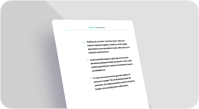ESSENTIALS MANAGEMENT Hashing out a concrete “work from home” policy can improve employee happiness/retention, but it’s largely dependent on your organization’s needs. Make sure you’re being fair across the board. Good mentorship happens organically, and should be directed by employee interests and growth. It also creates another opportunity for a natural, short feedback loop you can deifnitely use. It’s never too early to invest in good HR, whether it’s processes or people. This can absolutely include HR contractors. An outside perspective can be invaluable for founders who need big-picture reality checks. 128
