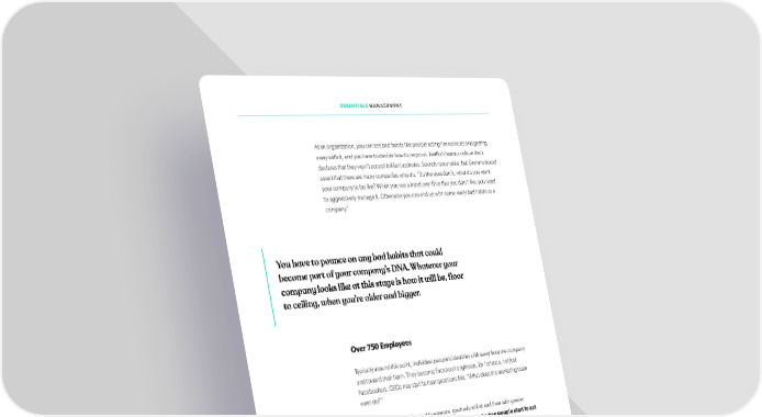ESSENTIALS MANAGEMENT At an organization, you can see bad habits like people acting like assholes and getting away with it, and you have to decide how to respond. Netlfix’s famous culture deck declares that they won’t accept brilliant assholes. Sounds reasonable, but Graham would assert that there are many companies who do. “So the question is, what do you want your company to be like? When you see a trend over time that you don’t like, you need to aggressively manage it. Otherwise you can end up with some really bad habits as a company.” You have to pounce on any bad habits that could become part of your company’s DNA. Whatever your company looks like at this stage is how it will be, lfoor to ceiling, when you’re older and bigger. Over 750 Employees Typically around this point, individual people’s identities shitf away from the company and toward their team. They become Facebook engineers, for instance, not just Facebookers. CEOs may start to hear questions like, “What does the marketing team even do?” This is also where politics start to emerge, gradually at ifrst and then with greater momentum. Graham deifnes politics as the moment when people start to act in their own self interest rather than the best interest of the company. It’s otfen shocking when it ifrst shows up. It can be a sign that you hired too quickly or aren’t communicating proactively enough about what behaviors will be rewarded, and about what you’re doing in the world. Strong, constant communication with the leaders of teams is the only way to keep things healthy. Everyone has to feel that they and their work are clearly tied to the broader goals of the organization. Everyone has to own calling out bad behavior when they see it. This is also when team leaders should look back at advice for CEOs to survive initial company scale. They can use most of the same tactics to keep their teams humming along without people feeling disillusioned or falling prey to the wrong priorities. You can also ifnd great advice on team scaling from other experts here, here and here. 62