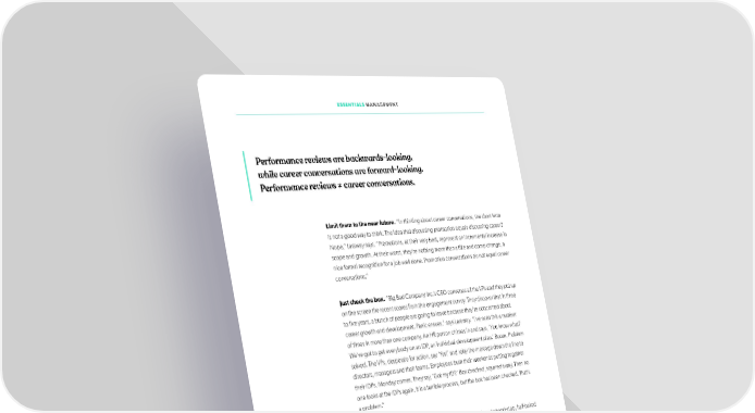 ESSENTIALS MANAGEMENT Performance reviews are backwards-looking, while career conversations are forward-looking. Performance reviews ≠ career conversations. Limit them to the near future. “In thinking about career conversations, the short term is not a good way to think. The idea that discussing promotion equals discussing career? Nope,” Laraway says. “Promotions, at their very best, represent an incremental increase in scope and growth. At their worst, they’re nothing more than a title and comp change, a nice formal recognition for a job well done. Promotion conversations do not equal career conversations.” Just check the box. “Big Bad Company Inc.’s CEO convenes all the VPs and they put up on the screen the recent scores from the engagement survey. They discover that in three to ifve years, a bunch of people are going to leave because they’re concerned about career growth and development. Panic ensues,” says Laraway. “I’ve seen this a number of times in more than one company. An HR person chimes in and says, ‘You know what? We’ve got to get everybody on an IDP, an individual development plan.’ Boom. Problem solved. The VPs, desperate for action, say ‘Yes!’ and relay the message down the line to directors, managers and their teams. Employees burn their weekends putting together their IDPs. Monday comes. They say, ‘Got my IDP.’ Box checked, squared away. Then no one looks at the IDPs again. It is a terrible process, but the box has been checked. That’s a problem.” Improvise. People sometimes approach career planning in a start-and-stop, half-baked way. “We plan a lot of things. We plan our families, plan our weekends, plan our vacations and plan our meals,” says Laraway. “It’s a little crazy to me that we don’t otfen put a lot of energy, intentionality, or conscientiousness toward our careers. We need to put a little more structure around that.” The way to ifx this imbalance is to follow the framework Laraway lays out for developing career action plans and having serious, meaningful — and even amazing — conversations with your employees. By doing that, you can really help them grow towards their dreams. By investing in your people in this highly differentiated way, otfen they’ll say, “I’m growing and my manager has my back. The grass isn’t always greener on the other side.” 112