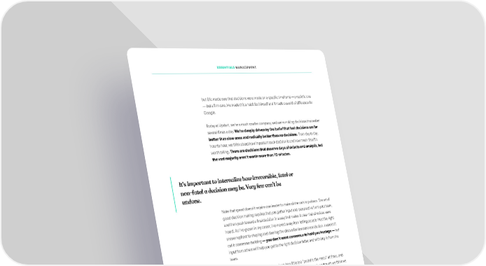 ESSENTIALS MANAGEMENT but Eric made sure that decisions were made on a speciifc timeframe — a realistic one — but a ifrm one. He made this a habit for himself and it made a world of difference for Google. Today at Upstart, we’re a much smaller company, and we’re making decisions that matter several times a day. We’re deeply driven by the belief that fast decisions are far better than slow ones and radically better than no decisions. From day to day, hour to hour, we think about how important each decision is and how much time it’s worth taking. There are decisions that deserve days of debate and analysis, but the vast majority aren’t worth more than 10 minutes. It’s important to internalize how irreversible, fatal or non-fatal a decision may be. Very few can’t be undone. Note that speed doesn’t require one leader to make all the calls top-down. The art of good decision making requires that you gather input and perspective from your team, and then push toward a ifnal decision in a way that makes it clear that all voices were heard. As I’ve grown in my career, I’ve moved away from telling people I had the right answer upfront to shaping and steering the discussion toward a conclusion. I wouldn’t call it consensus building — you don’t want consensus to hold you hostage — but input from others will help you get to the right decision faster, and with buy-in from the team. This isn’t a vote for rash decisions. I can be a little too “pedal to the metal” at times, and sometimes my co-founder Anna will say, “This is a big decision. Even though we think we know what to do, let’s give it 24 hours.” She’s saved us multiple times with that wisdom. There’s an art to knowing when to end debate and make a decision. Many leaders are reluctant to make the ifnal call when there are good arguments and a lot of emotions on both sides. We intuitively want the team to come to the right decision on their own. But I’ve found that people are enormously relieved when they hear that you’re grabbing the baton and accepting responsibility for a decision. Using the “CEO prerogative” — to make the ifnal call — isn’t something you ought to need every day. As long as you do it sparingly, you can actually make your employees more comfortable, and engender more trust by pulling the trigger, logically explaining your choice and sticking with it. In fact, gauging comfort on your team is a really helpful measure of whether you’re going fast enough or not. 45