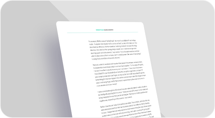ESSENTIALS MANAGEMENT For example, Twilio’s value of ‘being frugal’ was recently spotlighted in technology media. “A reporter interviewed me for a series entitled ‘Lunches With Unicorns.’ She described our oiffce as a ‘far-from-luxurious’ building ‘tucked in the back of a dingy structure. She called out the ‘grungy beige carpets’ and ‘a battered orange cone’ standing guard next to the elevator,” says Lawson. “A lot of people would be horriifed with this description of their company, but I’m actually proud. Our value of ‘being frugal’ is being lived and visible to those who observe.” That said, while it’s inevitable and important that people interpret your company values, the leadership should always weigh in on how they’re applied. “On the value of frugality, I’ve seen it manifest in exactly the wrong way,” says Lawson. “How many of you have a Hanes Beefy-T in your Goodwill pile at home that you got as swag from a company? If your company value was to be frugal, you may opt for the the $5 Hanes Beefy-T over the better iftting $7 American Apparel shirt. But the correct answer is that $5 that gets thrown away is not being frugal, but $7 that actually is appreciated by the customer is a much more valuable use of your money.” It takes some forethought to think about how your values ring truest in various situations, but intelligently applying them is a must. “Keep your eye out for ways in which values are being interpreted in ways that you did not imagine. That may be in both a positive and negative way, depending on the scenario,” says Lawson. Twilio’s ‘draw the owl’ value is the perfect case study. “In a symbolic, self-referential way, some employees took it on their own to create a mural in our oiffce by literally drawing the owl. I thought that was really cool and a direct result of living the value. When people evoked values on their own without prompting, that’s when you know it’s going well,” says Lawson. “Alternatively, several years ago Twilio had ifve different build-and-release systems for its sotfware. What happened was that ifve separate teams wanted a slightly improved version of the system, so they each “drew the owl” and built their own. The end result was various degrees of quality, test coverage of availability of those systems. It was a mess. When I caught wind of it, I asked why the hell would we have ifve different build systems. The response was: ‘Well, draw the owl. We had a problem; we solved it.’ That was an interesting and unintended application.” Expect your people to build from your values in ways you never thought. But their interpretations may not be the ideal application. Monitor how values manifest. 105