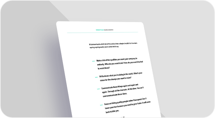 ESSENTIALS MANAGEMENT If Graham had to distill all of this advice into a simple checklist for founders eyeing rapid growth, here’s what she’d say: Make a list of the qualities you want your company to embody. Who do you want to be? How do you want it to feel to work there? Write down what you’re doing in the world. What’s your vision for the change you want to make? Communicate these things again and again and again. Through all the channels. All the time. You can’t overcommunicate these ideas. Focus on hiring quality people rather than speed. Don’t lower your bar because you need to grow faster. It will come back to bite you. Fire people. Just do it! Hire amazing leaders as early as you can and help them grow their capabilities as the company grows. Prioritize principles over process. Keep giving away your Legos! And tell everyone around you to do the same. It’s going to be okay. 63
