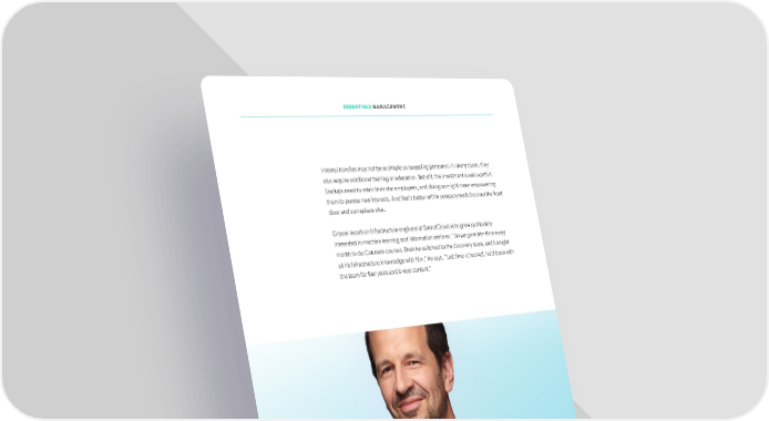 ESSENTIALS MANAGEMENT Internal transfers may not be as simple as swapping personnel. In many cases, they also require additional training or education. But still, the investment is well worth it. Startups need to retain their star employees, and doing so might mean empowering them to pursue new interests. And that’s better within company walls than out the front door and someplace else. Grosse recalls an infrastructure engineer at SoundCloud who grew particularly interested in machine learning and information retrieval. “So we gave him time every month to do Coursera courses. Then he switched to the discovery team, and brought all his infrastructure knowledge with him,” he says. “Last time I checked, he’d been with the team for four years and is very content.” Alexander Grosse 89