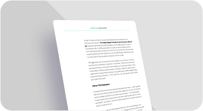 ESSENTIALS MANAGEMENT Google, Facebook and others have all conducted studies about what predicts the performance of a new hire. The single biggest indicator is who they were referred by. If you have high performers referring people, you’ll hire high performers. If you let low performers stay on staff because you’re too scared or insecure to ifre them, then you’re building your future company in that mold. Early hires plant seeds. And what ends up growing depends on their character and commitment. That also makes this phase the most critical one for ifring people (as unpleasant as that can sound). “The biggest favor you can do yourself, the other people who work for you, and really even the person you’re ifring, is to just do it,” says Graham. “Otherwise you have really great people sitting next to low performers wondering why you’re paying them money. It really erodes conifdence and has long-term ramiifcations. Really it should only take a couple months to assess whether someone is a good ift, and one of the healthiest things you can do for your company is — if the answer is no — part ways quickly. It doesn’t take a year to get to this answer.” 200 to 750 Employees A company of this size has the temperament and biases of a teenager — and the growing pains to prove it. The personality and habits of the organization are pretty much molded. Now it’s all about scaling them as more and more people join. “You’re literally going through a growth spurt, and you have to really focus on getting your maturity to match your big feet,” says Graham. “A lot of how this phase feels has to do with how good of a ‘parent’ you were earlier on.” That’s not to say you can’t make changes at this size. It’s just that everything is much harder — and gets increasingly so as you grow. Facebook was able to shitf its personality away from moving fast and breaking things to thoughtful, rapid innovation atfer 700 people. But it was only possible, Graham says, because Mark Zuckerberg was so good at articulating what he wanted the company to do and feel like. Atfer 200 employees, any shitf in culture needs to be undertaken very deliberately and with a lot of work by the leadership of the company — the CEO, of course, but also the leader of every major department. “Think about parenting an average teenager — you have to decide how to handle the bad habits they spontaneously develop. You catch them drinking or doing drugs, for instance. How do you handle it? Maybe it’s just the one time, or maybe it’s a sign of something you actually need to address. It could be bad later on if you ignore it completely but you also can’t overreact.” 61