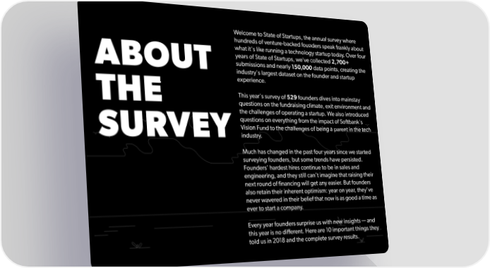 Welcome to State of Startups, the annual survey where hundreds of venture-backed founders speak frankly about what it's like running a technology startup today. Over four years of State of Startups, we’ve collected 2,700+ ABOUT submissions and nearly 150,000 data points, creating the industry's largest dataset on the founder and startup experience. THE This year's survey of 529 founders dives into mainstay questions on the fundraising climate, exit environment and the challenges of operating a startup. We also introduced questions on everything from the impact of Softbank's SURVEYVision Fund to the challenges of being a parent in the tech industry. Much has changed in the past four years since we started surveying founders, but some trends have persisted. Founders' hardest hires continue to be in sales and engineering, and they still can't imagine that raising their next round of financing will get any easier. But founders also retain their inherent optimism: year on year, they've never wavered in their belief that now is as good a time as ever to start a company. Every year founders surprise us with new insights — and this year is no different. Here are 10 important things they told us in 2018 and the complete survey results.