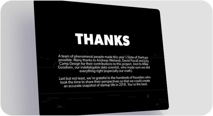 THANKS A team of phenomenal people made this year's State of Startups possible. Many thanks to Andreas Weiland, David Pocull and July Camp Design for their contributions to this project. And to Mike Goodwin, our indefatigable data scientist, who made sure we did everything right (especially our math). Last but not least, we're grateful to the hundreds of founders who took the time to share their perspectives so that we could create an accurate snapshot of startup life in 2018. You're the best.