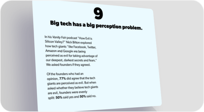 9 Big tech has a big perception problem. In his Vanity Fair podcast "How Evil is Silicon Valley?" Nick Bilton explored how tech giants “like Facebook, Twitter, Amazon and Google are being perceived as evil for taking advantage of our deepest, darkest secrets and fears.” We asked founders if they agreed. Of the founders who had an opinion, 77% did agree that the tech giants are perceived as evil. But when asked whether they believe tech giants are evil, founders were evenly split: 50% said yes and 50% said no.