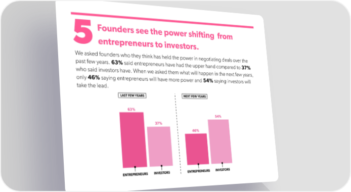 Founders see the power shifting from entrepreneurs to investors. 5 We asked founders who they think has held the power in negotiating deals over the past few years. 63% said entrepreneurs have had the upper hand compared to 37% who said investors have. When we asked them what will happen in the next few years, only 46% saying entrepreneurs will have more power and 54% saying investors will take the lead.