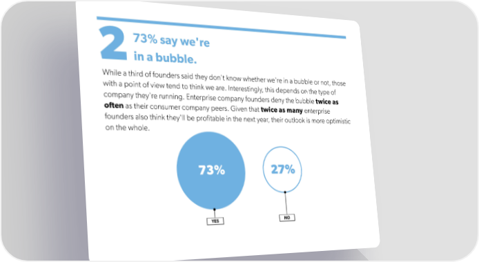 73% say we're in a bubble. 2 While a third of founders said they don't know whether we're in a bubble or not, those with a point of view tend to think we are. Interestingly, this depends on the type of company they're running. Enterprise company founders deny the bubble twice as often as their consumer company peers. Given that twice as many enterprise founders also think they'll be profitable in the next year, their outlook is more optimistic on the whole.