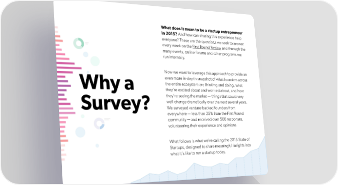 What does it mean to be a startup entrepreneur in 2015? And how can sharing this experience help everyone? These are the questions we seek to answer every week on the First Round Review and through the many events, online forums and other programs we run internally. Now we want to leverage this approach to provide an even more in-depth snapshot of what founders across Why a the entire ecosystem are thinking and doing, what they're excited about and worried about, and how they're seeing the market — things that could very well change dramatically over the next several years. Survey? We surveyed venture-backed founders from everywhere — less than 25% from the First Round community — and received over 500 responses, volunteering their experience and opinions. What follows is what we're calling the 2015 State of Startups, designed to share meaningful insights into what it's like to run a startup today.