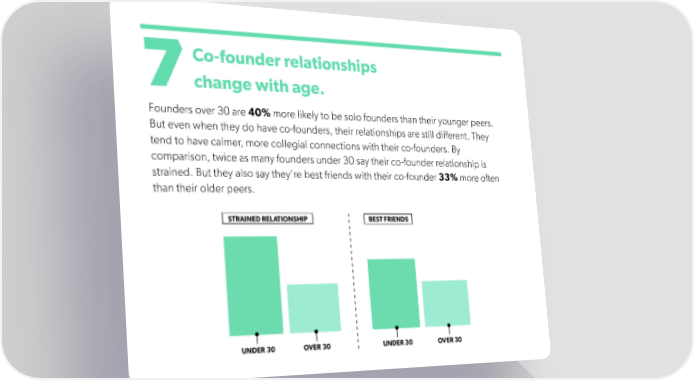 Co-founder relationships change with age. 7 Founders over 30 are 40% more likely to be solo founders than their younger peers. But even when they do have co-founders, their relationships are still different. They tend to have calmer, more collegial connections with their co-founders. By comparison, twice as many founders under 30 say their co-founder relationship is strained. But they also say they're best friends with their co-founder 33% more often than their older peers.