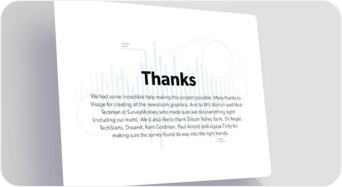 Thanks We had some incredible help making this project possible. Many thanks to Visage for creating all the newsroom graphics. And to Will Aldrich and Nick Teckman at SurveyMonkey who made sure we did everything right (including our math). We’d also like to thank Silicon Valley Bank, SV Angel, TechStarts, DreamIt, Kent Goldman, Paul Arnold and Ligaya Tichy for making sure the survey found its way into the right hands.