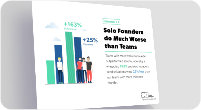 FINDING #6 +163% Performance Solo Founders +25% do Much Worse Valuations than Teams Teams with more than one founder outperformed solo founders by a whopping 163% and solo founders' seed valuations were 25% less than our teams with more than one founder. 10years.firstround.com