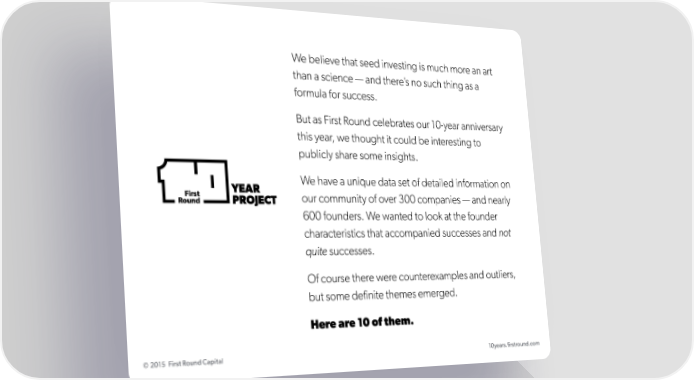 We believe that seed investing is much more an art than a science — and there’s no such thing as a formula for success. But as First Round celebrates our 10-year anniversary this year, we thought it could be interesting to publicly share some insights. We have a unique data set of detailed information on our community of over 300 companies — and nearly 600 founders. We wanted to look at the founder characteristics that accompanied successes and not quite successes. Of course there were counterexamples and outliers, but some definite themes emerged. Here are 10 of them. © 2015 First Round Capital 10years.firstround.com